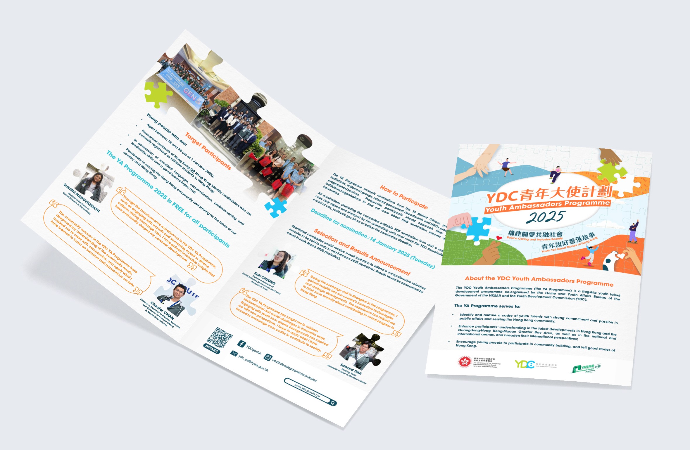 The YDC Youth Ambassadors Programme (YA Programme) is a premier initiative for youth talent development, co-organized by the Home and Youth Affairs Bureau of the HKSAR Government and the Youth Development Commission (YDC). Launched in 2017 and formalized in 2019, the programme aims to identify and nurture a group of young individuals who aspire to be future leaders across various sectors. These youth are dedicated to serving society and committed to striving for the betterment of both the country and Hong Kong. I am responsible for creating the main visual design and promotional materials, including posts on social media and printed materials.